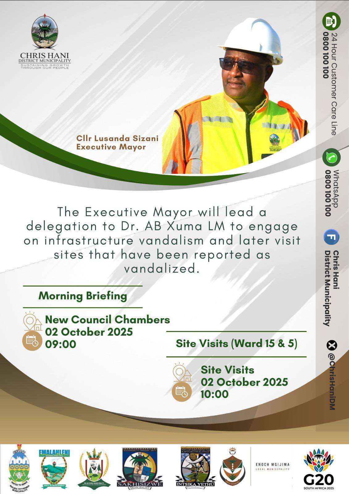 The Executive Mayor will lead a delegation to Dr. AB Xuma LM to engage on infrastructure vandalism and later visit sites that have been reported as vandalized.